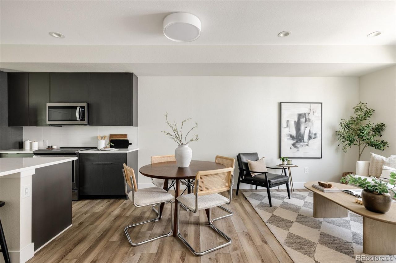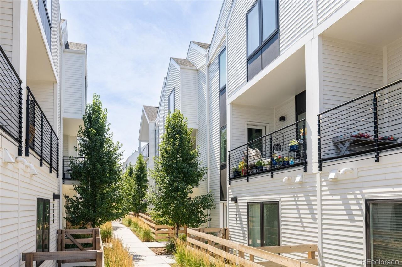 Welcome to Parkview Residences?a quiet, contemporary townhome community offering energy-efficient living, thoughtful design, and an unbeatable Lakewood location. Built in 2022, this 3-level, 2-bedroom, 2.5-bath home blends modern style with smart upgrades and sustainability. The second level features a bright, open floorplan that connects the kitchen, dining, and living areas. The kitchen boasts espresso cabinetry, quartz counters, a white tile backsplash, and upgraded stainless steel appliances?including a sleek induction cooktop and stove. Designer lighting and clean lines make the space feel elevated and inviting, while large windows and a private balcony bring in abundant natural light. A convenient powder room is also located on this level for guests. Upstairs are two spacious bedrooms, each with its own en-suite bathroom and large closet. Window coverings are installed in the bedrooms for privacy, and the upgraded Miele washer and dryer are located on the same level for easy laundry access. Additional smart and energy-efficient features include a newer heat pump water heater, smart thermostat, smart deadbolt, and a 240V outlet in the garage?perfect for EV charging. Enjoy indoor-outdoor connectivity, a peaceful off-street setting, and access to a community garden. The HOA covers roof maintenance, snow removal, landscaping, and recycling for true low-maintenance living. Location is everything?and this one is exceptional. Youre just steps from a park and rec center and extremely close to Belmars shopping, dining, entertainment, and grocery options. With quick access to Light Rail, 6th Ave, Red Rocks, and downtown Denver, this move-in ready townhome offers the perfect balance of comfort, efficiency, and convenience.