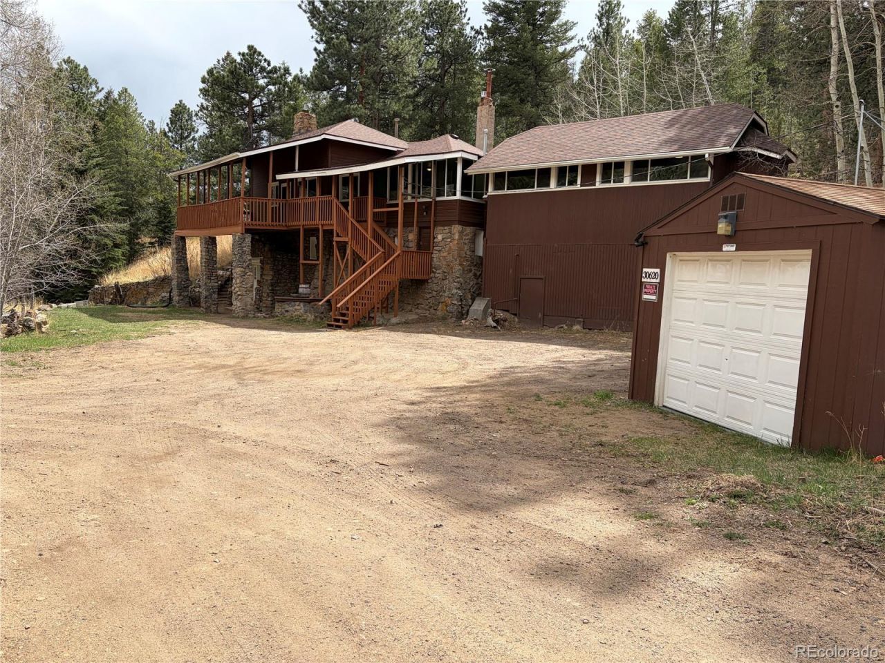 BEAUTIFUL WOODED PROPERTY WITH CREEK AND 2 SPRING-FED PONDS. This unique gem in the foothills is only a 25-30 minute drive to Golden, Boulder or Arvada. This large, historic stone lodge sits on 5.33 acres. Enter the property through two large handcrafted stone pillars, cross the creek and the adventure begins. Relax on your huge covered deck, high in the tree canopy overlooking the front yard, babbling creek and waterfall. Take a walk over the wood bridge and follow a path to the stone-lined swimming pond. Have your morning coffee on the concrete patio adjacent to the fenced dog/play area and watch the sunrise. Up the hill behind the home you can hike, ski, snowshoe, horseback ride, camp or bike while enjoying the pines, hardwoods and endless birds and wildlife. Surrounded by all this natural beauty and still being within a 5 minute walk to a restaurant, coffee shop, liquor store, convenience store, post office, salon and gas station. The 2-story great room was used for musical and theatrical performances with an overlooking interior balcony. The large stone fireplace has been retrofitted with an efficient natural gas insert. The living room has a vaulted ceiling with wood logs and also features another stone fireplace with a gas insert. Recent updates provide modern conveniences while retaining the historic character. Recent renovations include: Lifetime Warranty Roof (2016), Vinyl Double Pane Windows (2018-2021), 200Amp Panel (2014), Concrete Patio (2023), (2) Natural Gas Forced Air Furnaces (2012/2013), (2) Natural Gas Fireplace Inserts (2022), Additional Insulation (2022), Septic Tank Replacement (2012), Kitchen/Bathroom redo (2013), Pex Plumbing (2012), Main Waste Lines (2018). HORSE PROPERTY? This property has a small hay shed behind the home, land to create riding trails and a year-round natural water supply! The back driveway has a recorded easement for easy access to or for your RV. Below there are 2 utility rooms with power and storage space.
