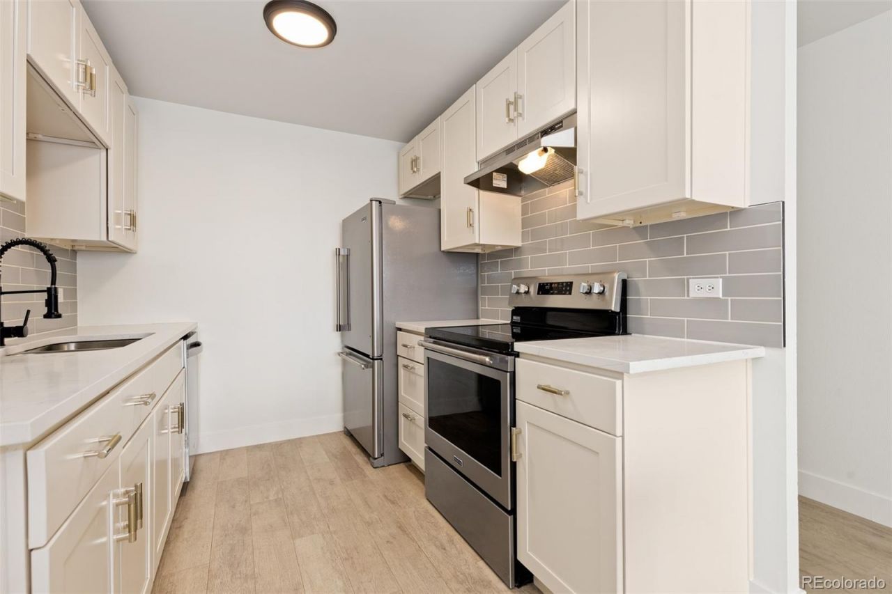 Perched high above the vibrant energy of Capitol Hill, this penthouse residence blends refined design with effortless livability, where sophistication meets a touch of playful charm. Bathed in full southern sun, the home captures unobstructed mountain views stretching to Pikes Peak, creating a stunning daily backdrop. Inside, the open-concept layout feels expansive and inviting, with fresh paint, updated lighting, and curated finishes throughout. The kitchen shines with a crisp subway tile backsplash, modern hardware, and seamless flow into the living space. The primary bedroom offers a peaceful retreat, featuring a charming bay window and exceptional storage. Rarely found in a one-bedroom condo is an abundance of closets, with two walk-ins plus an additional closet in the bedroom and a full linen. The updated bathroom mirrors the homes clean aesthetic with timeless tile and thoughtful functionality, making it enjoyable for two people to get ready or turn down for the evening. Modern comforts include custom motorized blinds and a rare semi-private laundry shared with just one other owner. Just one staircase away, a rooftop oasis offers 360-degree views and abundant seating feel like an extension of your favorite coffee shop, but with an exclusive feel. A beautiful pool, community garden, and a fully equipped fitness center rounds out the amenity package, making wellness and relaxation effortlessly accessible in this community. An oversized parking space conveniently near the elevator accommodates both an SUV and motorcycle, with additional storage and bike space nearby. Guest parking adds rare convenience not often offered in this neighborhood. With 24-hour concierge service ensuring security and seamless package delivery, every detail is covered. Surrounded by exceptional walkability to dining, coffee, fitness, and groceries, plus a comprehensive HOA and reservable guest suite in the building, this lovely home, high in the sky defines elevated, effortless living.
